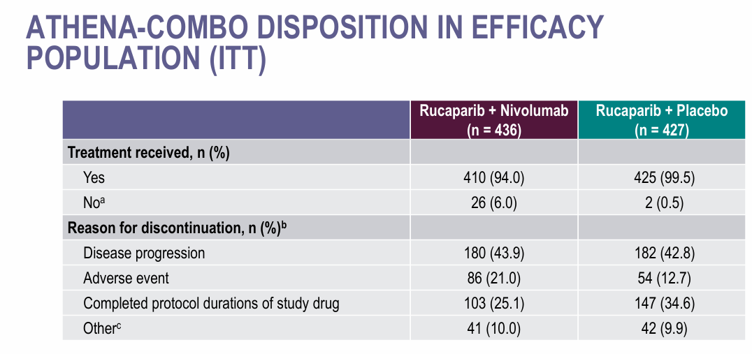 B.J.Monk,et al.LBA30-ATHENA-COMBO,a phase III,randomized trial comparing rucaparib(RUCA)+nivolumab(NIVO)combination therapy vs RUCA monotherapy as maintenance treatment in patients(pts)with newly diagnosed ovarian cancer(OC).Annals of Oncology(2024)35(suppl_2):1-72.10.1016/annonc/annonc1623