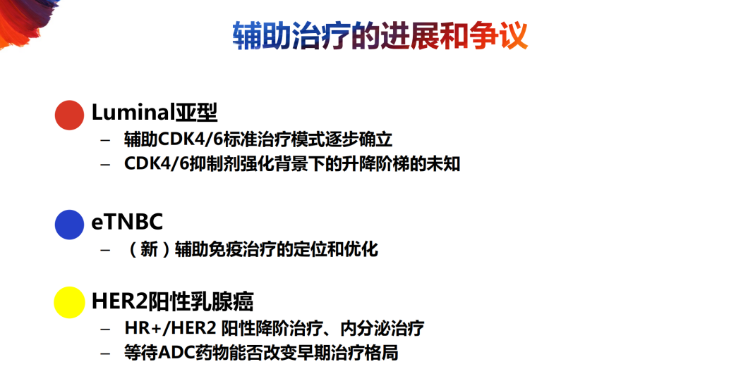 范蕾教授根据乳腺癌的分子分型,从Luminal亚型乳腺癌、三阴性乳腺癌(TNBC)、HER2阳性乳腺癌三个亚型分别介绍了当前辅助治疗的进展和争议。