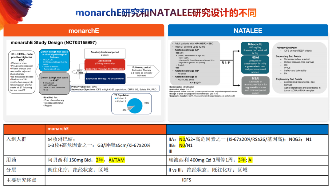 范蕾教授介绍道,monarchE研究和NATALEE研究是评估CDK4/6抑制剂在Luminal亚型乳腺癌辅助治疗中疗效的两项重要研究,但这两项研究在试验设计及研究结果上存在一定差异。monarchE研究纳入的是早期高危HR+/HER2-乳腺癌患者,包括腋窝淋巴结转移≥4枚或1-3枚腋窝阳性淋巴结且伴有高危因素(如组织学分级3级、肿瘤直径≥5cm或Ki-67≥20%)的患者。monarchE研究3年iDFS绝对值差值为4.8%,随着随访时间的延长,5年iDFS绝对值差值扩大至7.6%。