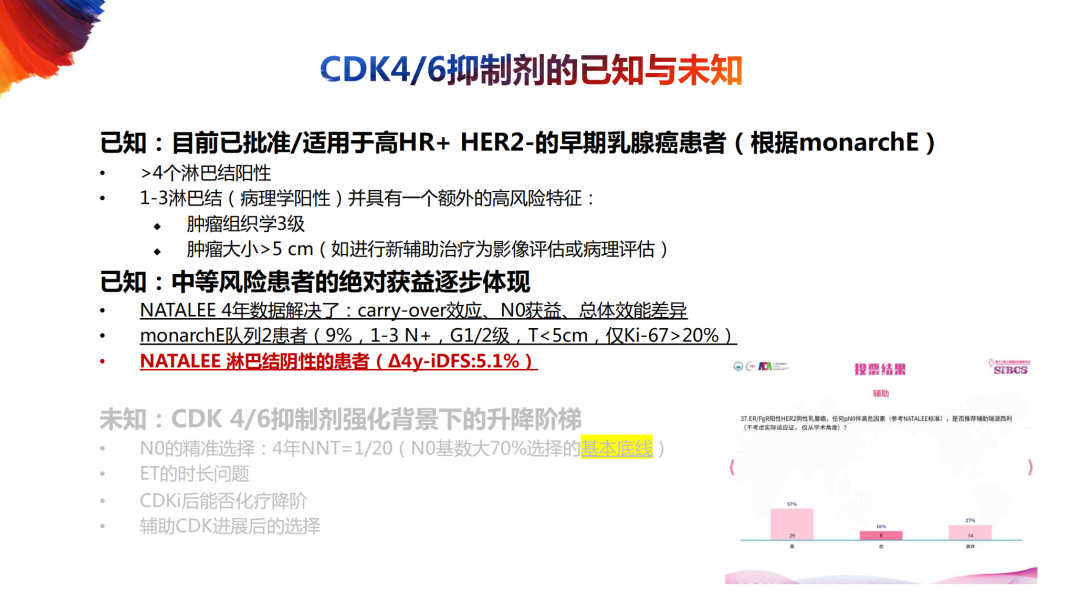 1、N0人群的治疗选择:NATALEE研究中仅入组了部分N0患者(约15%),而在真实世界中,Luminal亚型乳腺癌患者人群中N0患者占比高达60%~70%。因此,对于N0患者如何精准选择CDK4/6抑制剂治疗是一个重要问题。