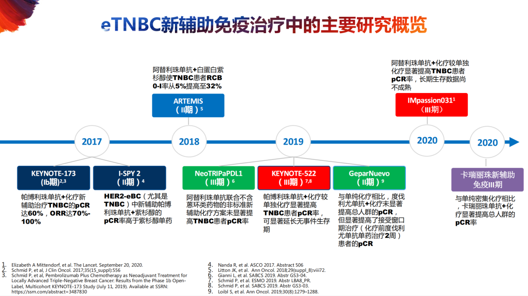 三阴性乳腺癌(TNBC)因其独特的临床特征和免疫原性,一直都是临床研究的热点。近年来,免疫治疗在TNBC领域取得了显著进展。KEYNOTE-522研究总生存数据的公布,为我们展示了新辅助到辅助免疫治疗地位的确立和进一步的人群优化。但三阴性乳腺癌新辅助免疫治疗的多项临床研究中,患者临床获益和生存结果之间存在差异,仍需要具体分析免疫治疗的疗效。