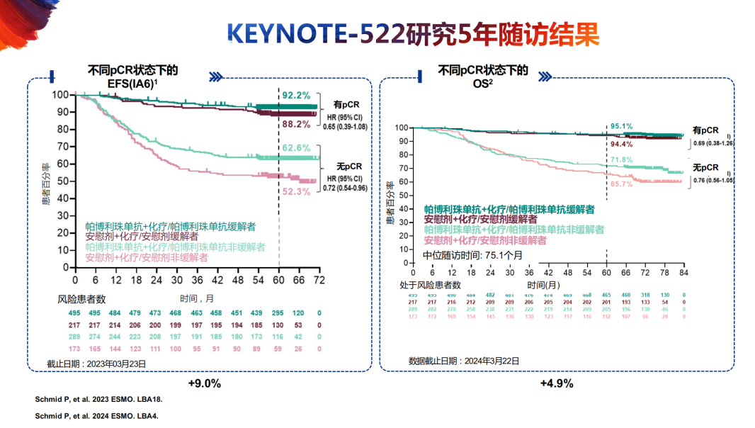 KEYNOTE-522研究是一项评估新辅助帕博利珠单抗联合化疗序贯帕博利珠单抗单药辅助治疗早期TNBC的Ⅲ期研究。该研究于2024年ESMO大会上公布了中位随访5年的总生存数据,结果显示,新辅助免疫治疗显著提高了患者的无事件生存期(EFS)和总生存期(OS)。特别是对于非病理学完全缓解(non-pCR)的人群,OS获益更为显著。