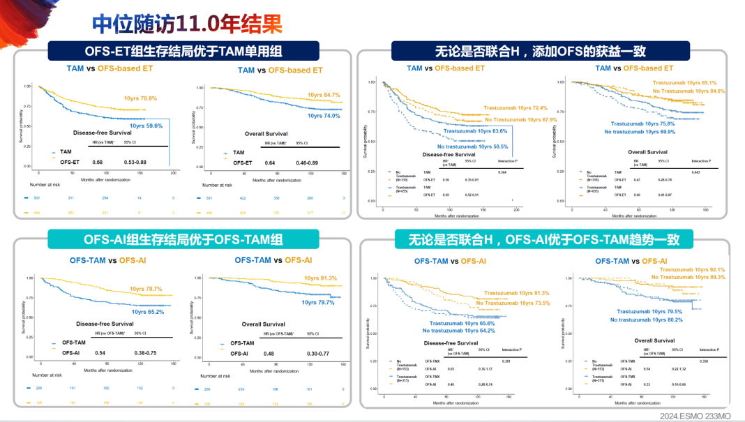 HERA研究对绝经前HR阳性/HER2阳性的三阳性乳腺癌患者进行了卵巢功能抑制(OFS)联合治疗的分析。在这项研究中,共分析了965例患者,其中501例患者(51.9%)只接受他莫昔芬治疗,464例患者(48.1%)接受含OFS的内分泌治疗(他莫昔芬[n=269,27.9%]或依西美坦[n=195,20.2%])。结果显示,OFS+内分泌治疗优于单药内分泌治疗,同时OFS联合芳香化酶抑制剂(AI)疗效也优于OFS联合他莫昔芬(TAM)。这一结果再次提示我们,HR阳性/HER2阳性乳腺癌患者的内分泌治疗依然非常重要。