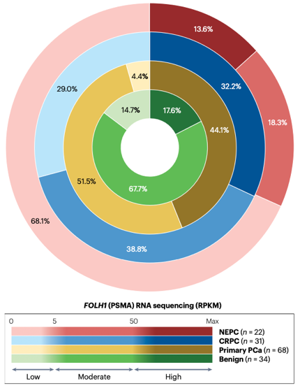 有研究评估了LuCaP系列PDX模型以及UW-TAN和SU2C-PCF患者队列,发现相比PSMA高表达患者,PSMA低表达患者具有显著的全局表达变化,患者的炎症反应、缺氧、上皮-间质转化以及代谢和糖酵解通路增加。