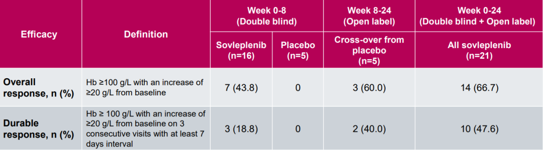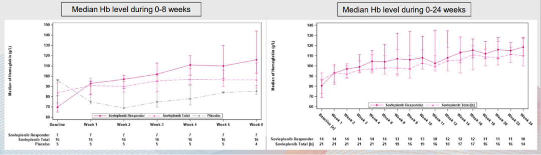 在治疗起效时间方面,在起始就接受索乐匹尼布治疗的患者中,Hb水平较基线增加≥15 g/L的中位时间为1.3周。在整体患者人群中,接受索乐匹尼布治疗的患者达到Hb≥100 g/L,并且较基线增加≥20 g/L的中位时间为4.9周。此外,在持续缓解的作用方面,根据24周研究数据,索乐匹尼布治疗的中位缓解持续时间达到20.5周