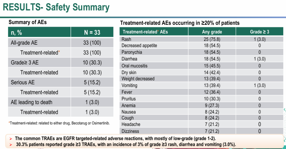 II期BOOSTER试验将Becotarug与三代EGFR-TKI奥希替尼联合用于治疗典型EGFR突变NSCLC患者,包含多个队列。在入组33例初治IV期EGFR突变NSCLC患者的队列,Becotarug(6 mg/kg Q3W)+奥希替尼(80mg QD)的ORR为78.8%,疾病控制率(DCR)为81.8%,PFS为20.8个月(尚未成熟),中位OS未达到,全级别不良事件(AE)的发生率为100%,≥3级AE发生率为30.3%,严重AE发生率为15.2%。
