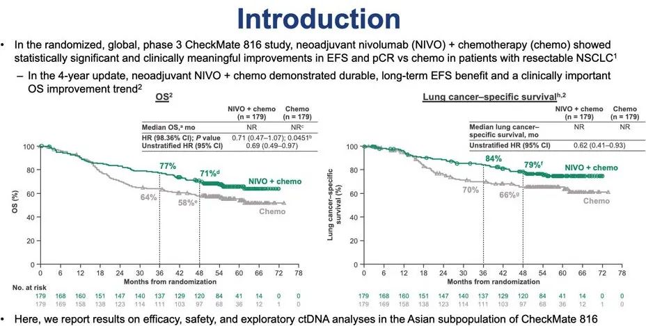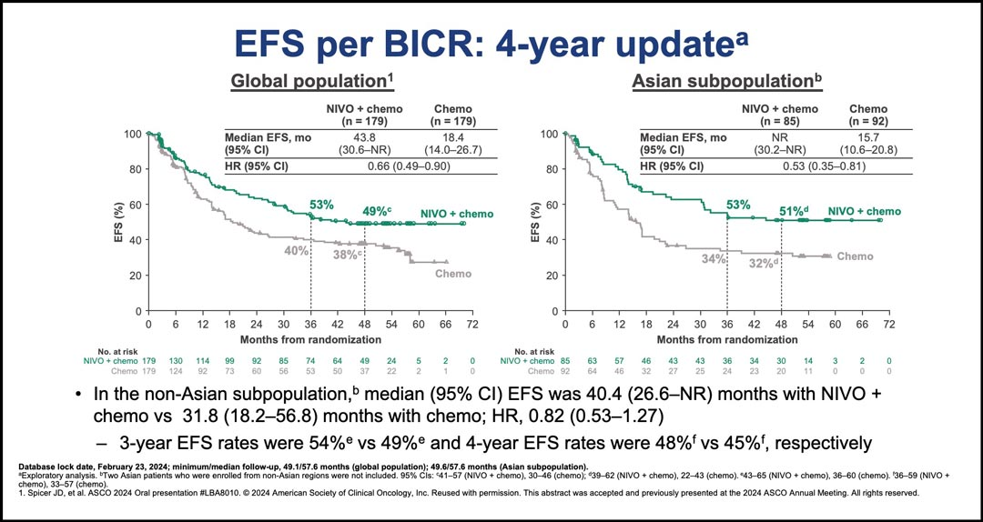 在全球人群中,新辅助纳武利尤单抗+化疗表现出持久的长期无事件生存(EFS)和临床上显著的总生存(OS)改善。此外,在亚洲亚组中,与单独化疗相比,新辅助纳武利尤单抗+化疗达到更高的病理完全缓解(pCR)率和长期EFS获益。