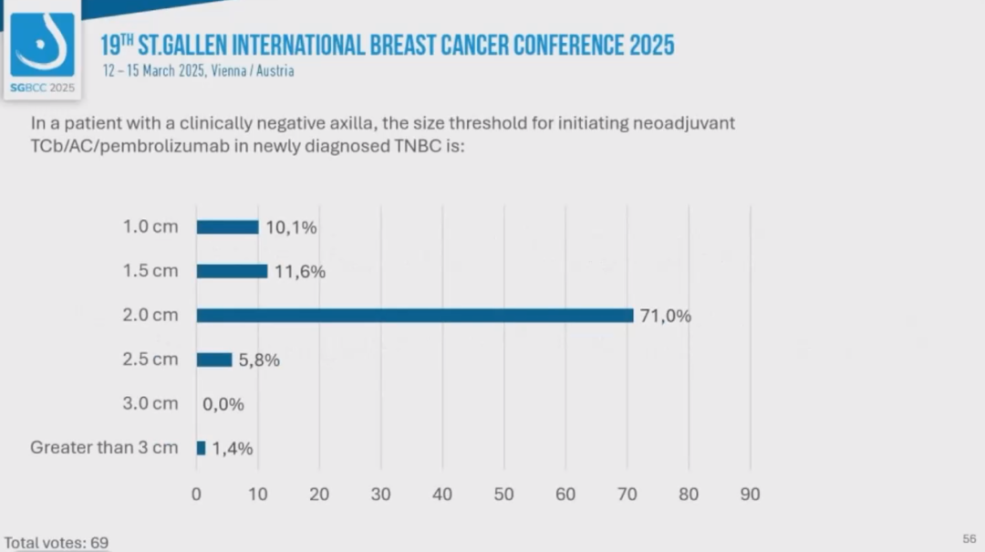 (1)对于临床腋窝淋巴结阴性的新诊断TNBC患者,启动新辅助TCb/AC/帕博利珠单抗治疗的肿瘤大小阈值是: