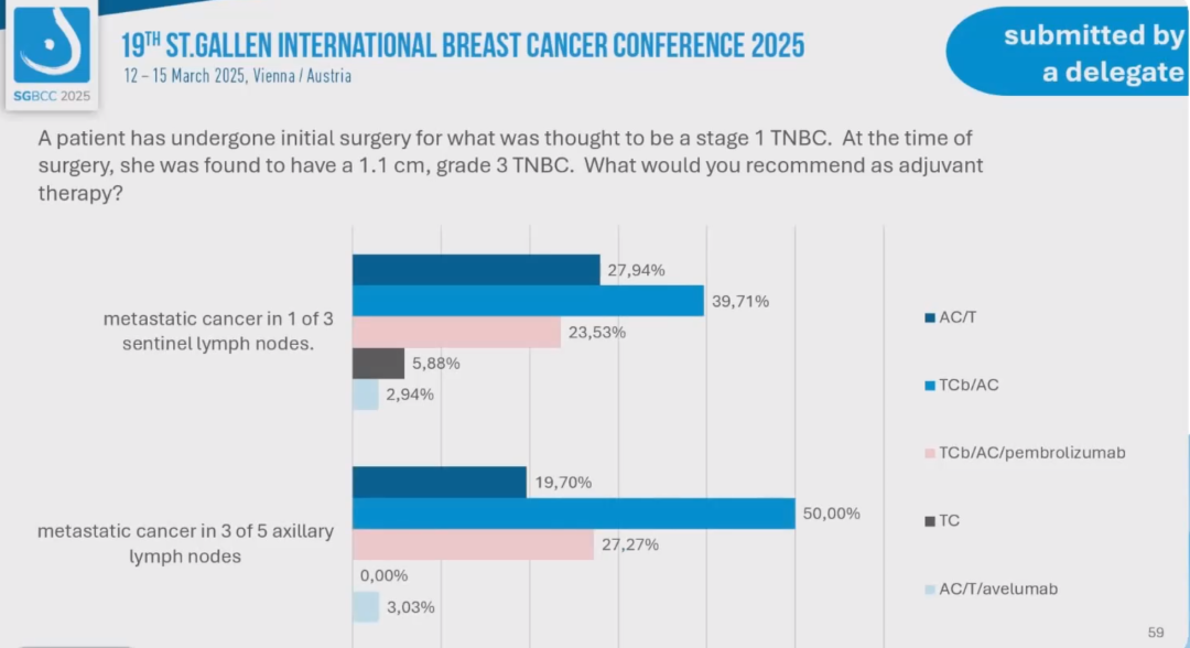 (4)患者因原以为的I期TNBC接受初次手术。术中发现为1.1厘米、3级TNBC,3枚前哨淋巴结中1枚见转移癌/5枚前哨淋巴结中3枚见转移癌。您会推荐哪种辅助治疗?