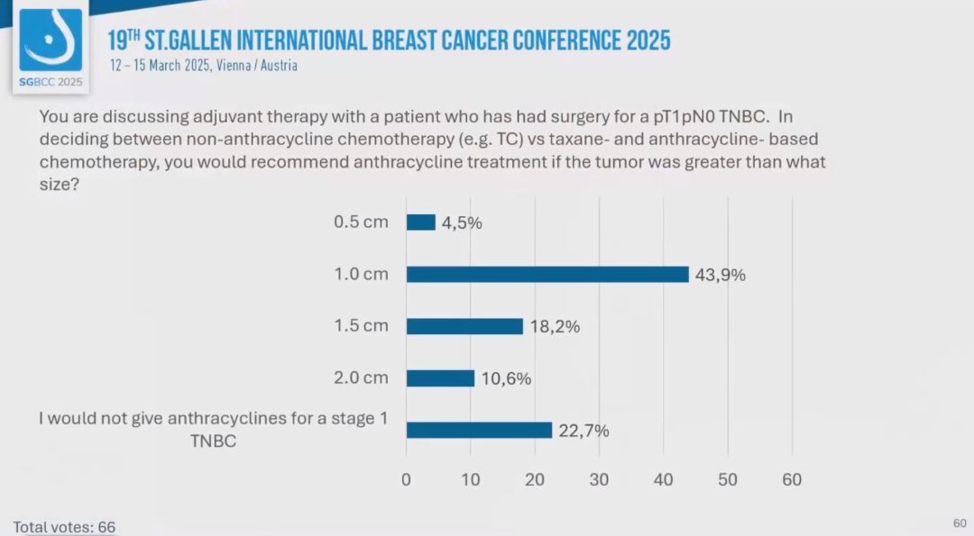 (5)您正与pT1pN0 TNBC术后患者讨论辅助治疗。在选择非蒽环类化疗(如TC)或含紫杉/蒽环类化疗时,当肿瘤大于多少时您会推荐蒽环类治疗?