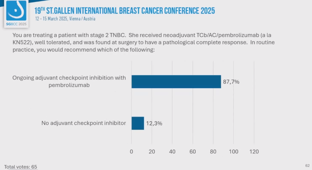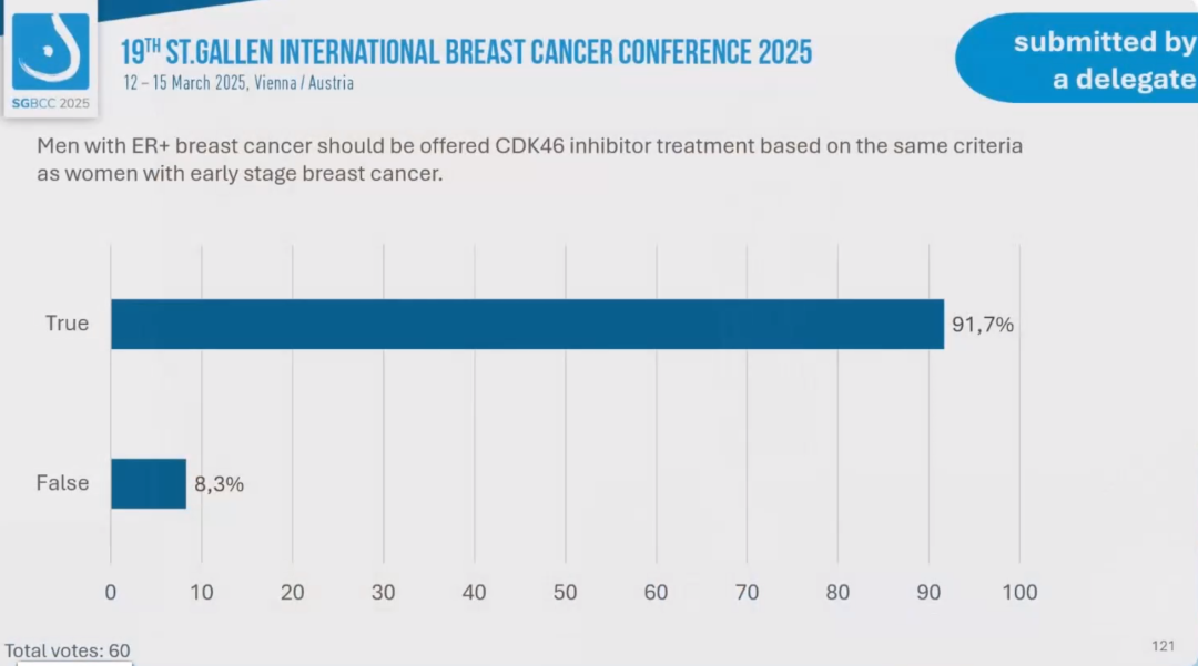 第19届St.Gallen国际乳腺癌大会(SGBCC 2025)于当地时间2025年3月12~15日在音乐之都维也纳举行。大会的最后一天,专家投票压轴登场。《肿瘤瞭望》整理了包括三阴性乳腺癌、HER2阳性乳腺癌、激素受体阳性乳腺癌在内的系统治疗专家投票,现成文如下,与大家一起感受早期乳腺癌治疗决策的圣加伦氛围。