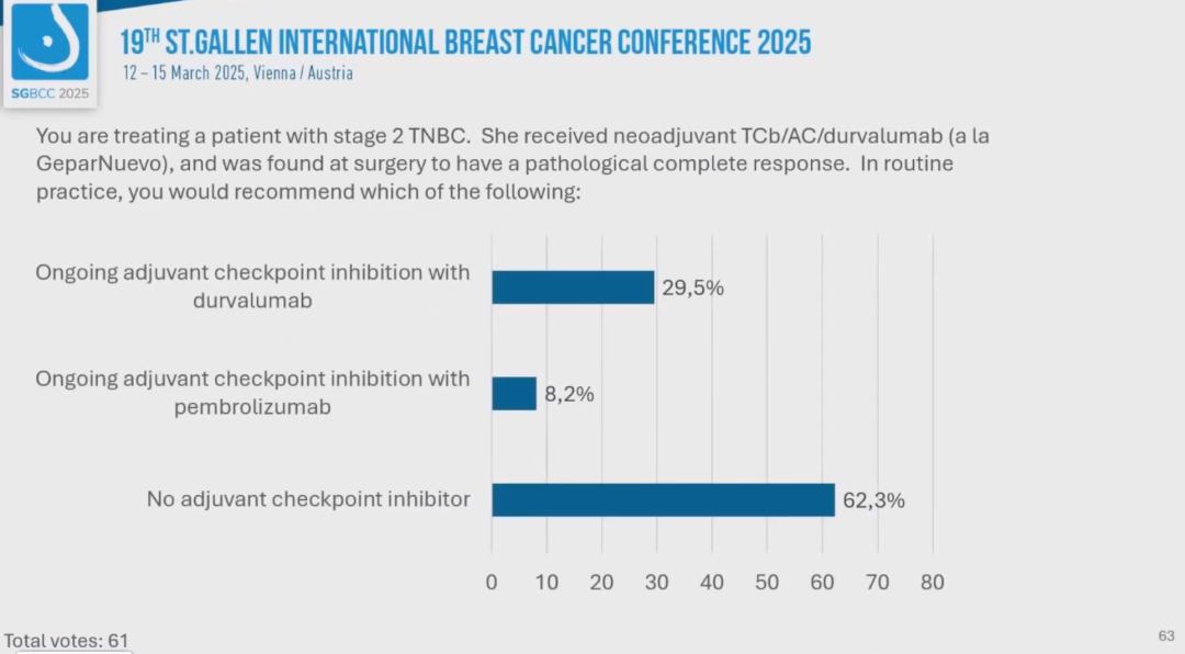 (8)您正在治疗II期TNBC患者。患者接受新辅助TCb/AC/度伐利尤单抗治疗(参照GeparNuevo研究),术后发现病理完全缓解。常规实践中您会推荐: