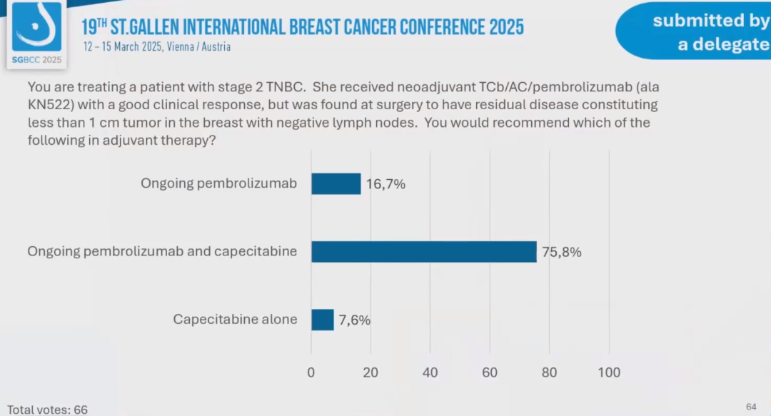 (9)您正在治疗II期TNBC患者。患者接受新辅助TCb/AC/帕博利珠单抗治疗(参照KN522研究)后临床反应良好,但术中发现残留病灶(乳腺肿瘤<1厘米且淋巴结阴性)。您会推荐哪种辅助治疗?