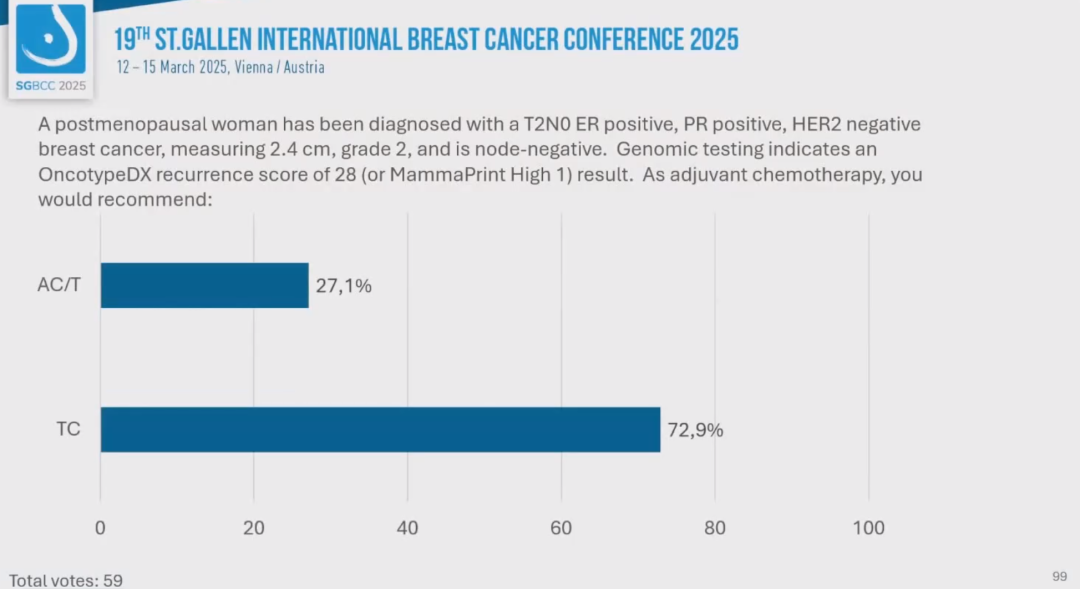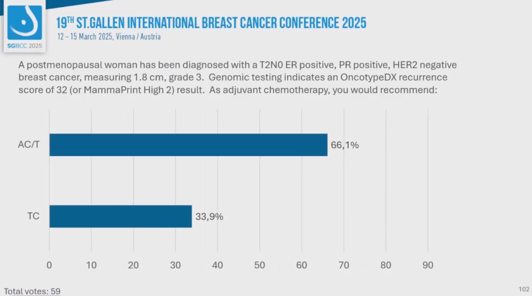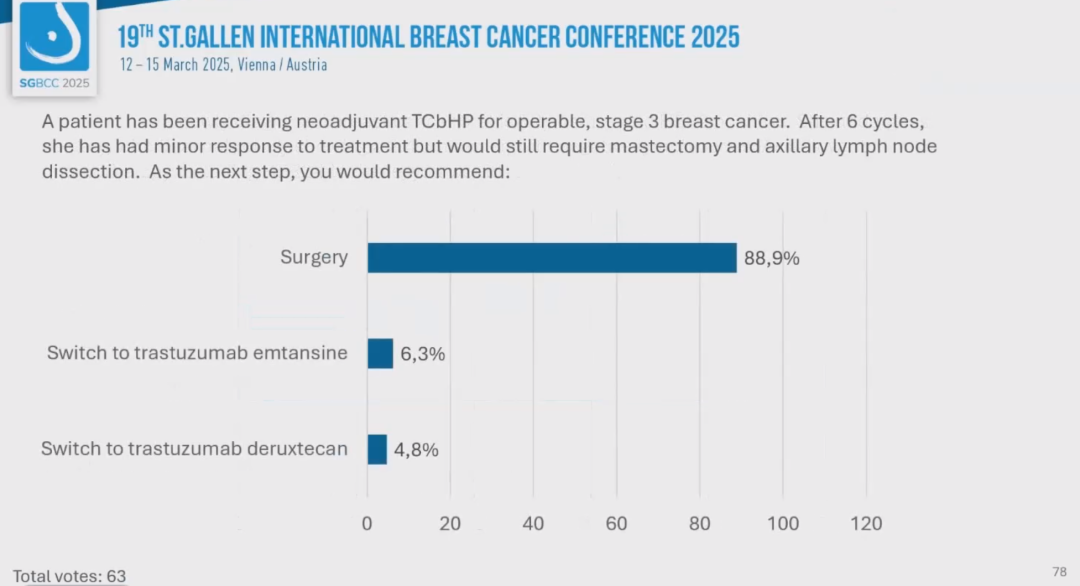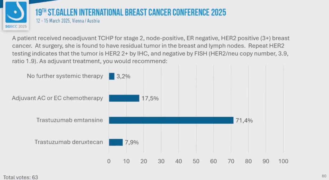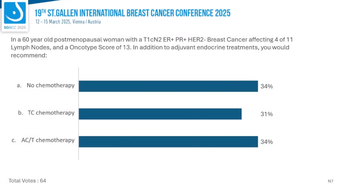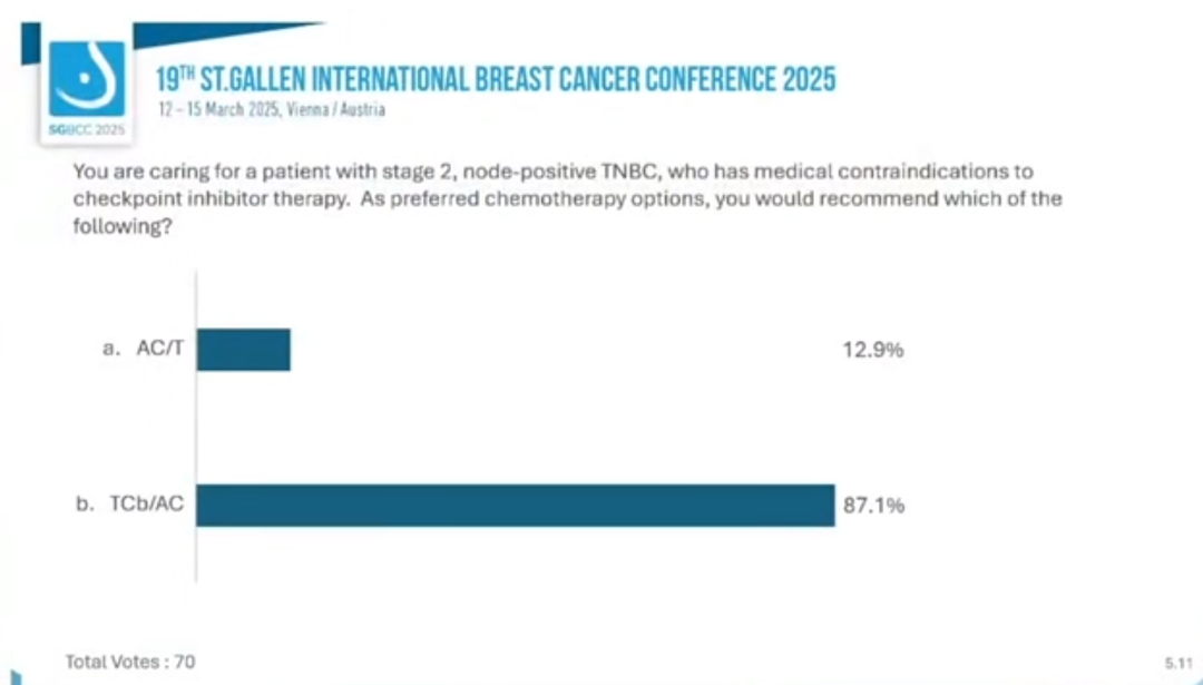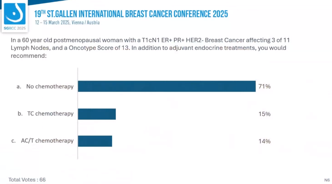 编者按:第19届St.Gallen国际乳腺癌大会(SGBCC 2025)于当地时间2025年3月12~15日在音乐之都维也纳举行。大会的最后一天,专家投票压轴登场。《肿瘤瞭望》整理了包括三阴性乳腺癌、HER2阳性乳腺癌、激素受体阳性乳腺癌在内的系统治疗专家投票,现成文如下,与大家一起感受早期乳腺癌治疗决策的圣加伦氛围。
