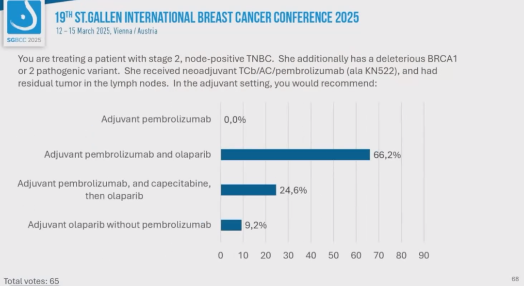 (12)您正在治疗携带BRCA1/2致病变异的II期淋巴结阳性TNBC患者。患者接受TCb/AC/帕博利珠单抗新辅助治疗(参照KN522研究)后获得病理完全缓解。您会推荐奥拉帕利辅助治疗吗?