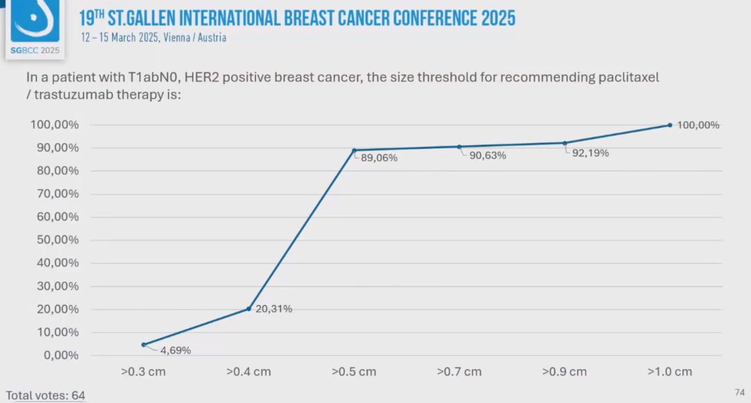 (2)对于T1abN0、HER2阳性乳腺癌患者,建议紫杉醇/曲妥珠单抗治疗的肿瘤大小阈值是: