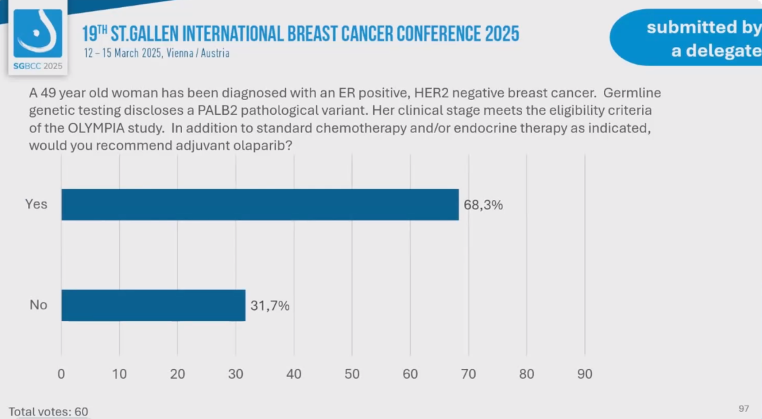 (11)一名49岁女性诊断为ER阳性、HER2阴性乳腺癌,胚系基因检测发现PALB2致病性变异。其临床分期符合OLYMPIA研究入组标准。除标准化疗和/或内分泌治疗外,是否建议辅助奥拉帕利?