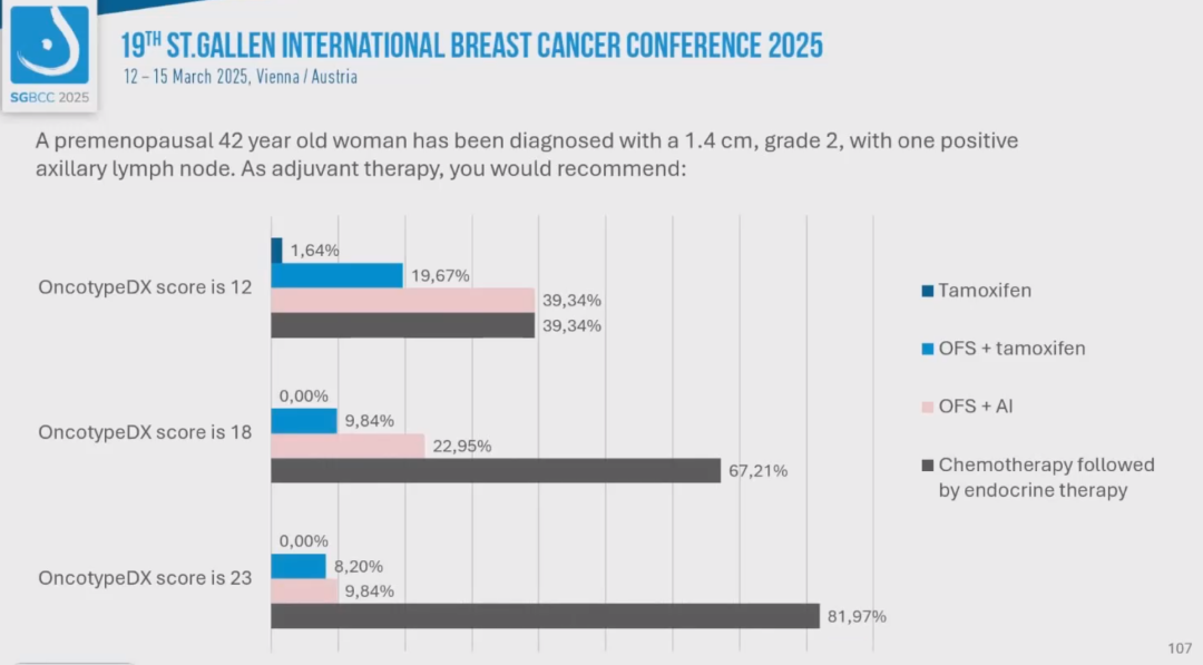 (20)42岁绝经前女性诊断为1.4 cm、2级、1枚腋窝淋巴结阳性乳腺癌。在OncotypeDX评分分别为12分、18分、23分时。辅助治疗建议: