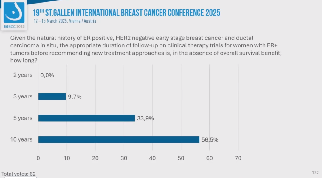 (29)鉴于ER阳性、HER2阴性早期乳腺癌及导管原位癌的自然病程,在缺乏总生存期获益的情况下,推荐新治疗方案前需临床治疗试验随访的合理时长是?