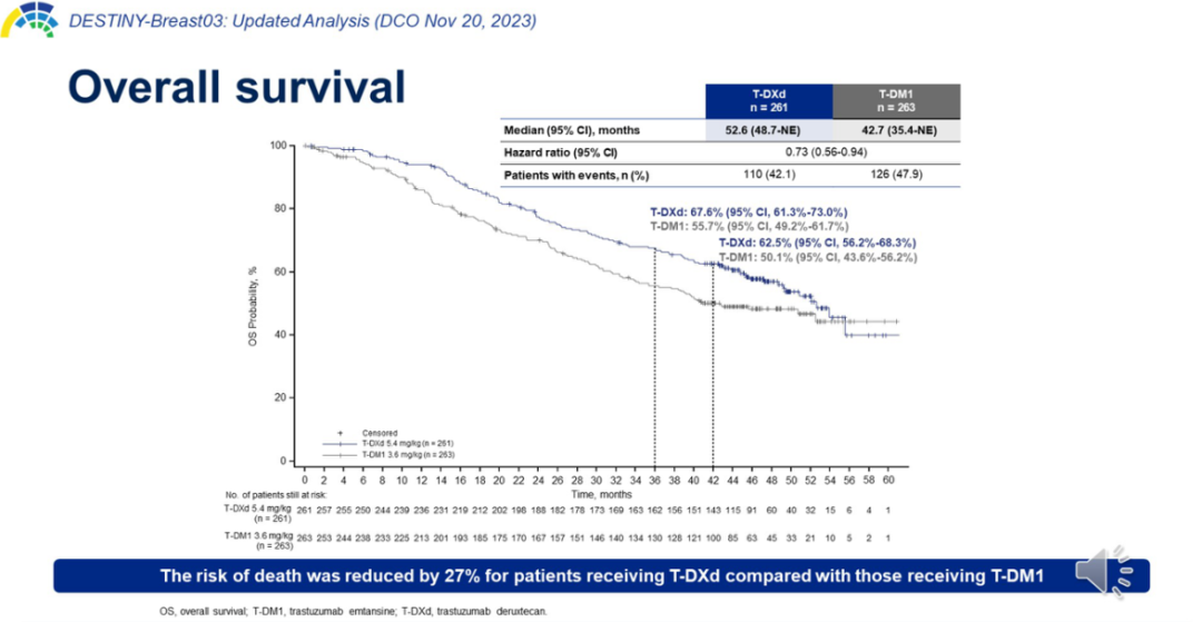 共524例患者被随机分组(T-DXd组,n=261;T-DM1组,n=263)。截至2023年11月20日,T-DXd组的中位随访时间为43.0个月(范围:0.0~62.9个月),T-DM1组为35.4个月(范围:0.0~60.9个月)。T-DXd组的mOS为52.6个月(95%CI:48.7~不可评估[NE]),T-DM1组的mOS为42.7个月(95%CI:35.4~NE),风险比(HR)为0.73(95%CI:0.56~0.94)。两组分别有110例(42.1%)和126例(47.9%)患者发生OS事件。T-DXd组36个月时的OS率为67.6%(95%CI:61.3~73.0%),T-DM1组36个月时的OS率为55.7%(95%CI:49.2~61.7%)。