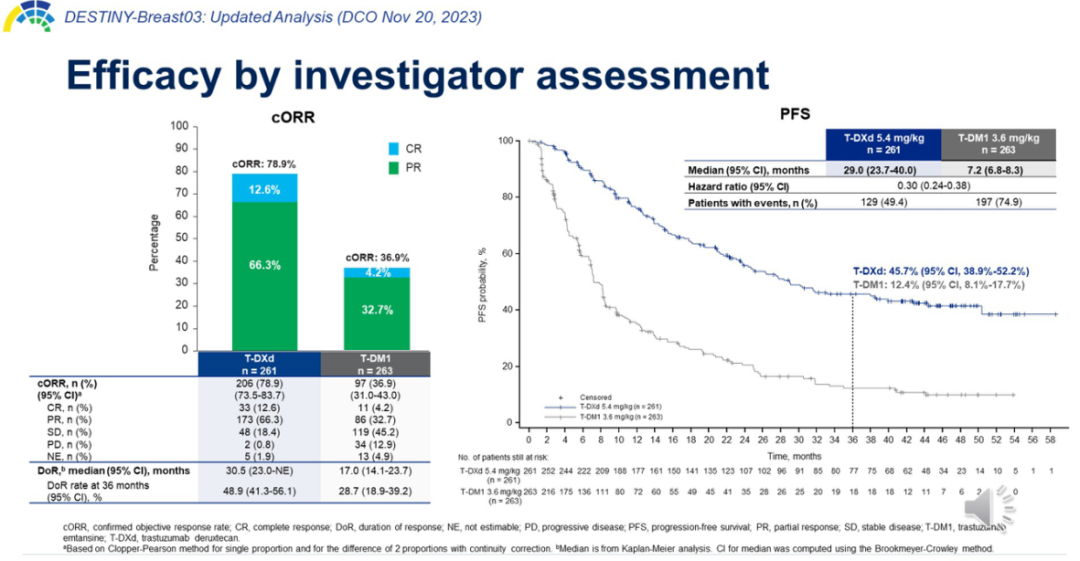 T-DXd组的mPFS为29.0个月(95%CI:23.7~40.0),T-DM1组为7.2个月(95%CI:6.8~8.3);24个月时的PFS率:T-DXd组为55.8%(95%CI:49.1~62.0%),T-DM1组为20.6%(95%CI:15.4~26.4%)。36个月时的PFS率:T-DXd组为45.7%(95%CI:38.9~52.2%),T-DM1组为12.4%(95%CI:8.1~17.7%)。T-DXd组的mPFS 2为45.2个月,T-DM1组的mPFS 2为23.1个月。