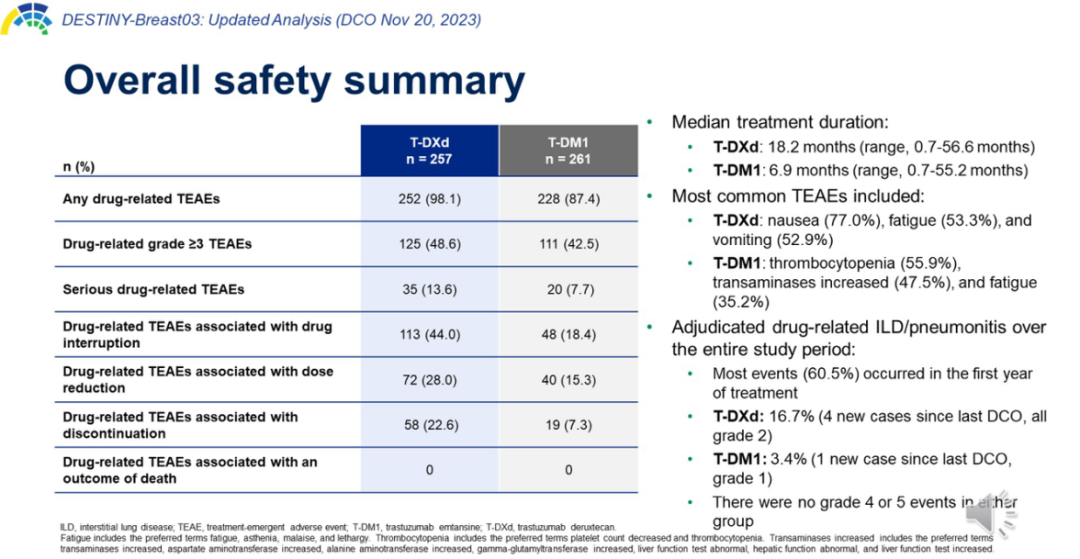 T-DXd组的中位治疗持续时间为18.2个月(范围:0.7~56.6个月),T-DM1组为6.9个月(范围:0.7~55.2个月);两组治疗期间出现的不良事件(TEAEs)发生率与之前DCO时一致。T-DXd组的常见TEAEs包括:恶心(77.0%)、疲劳(53.3%)、呕吐(52.9%);T-DM1组的常见TEAEs包括:血小板减少症(55.9%)、转氨酶升高(47.5%)、疲劳(35.2%)。