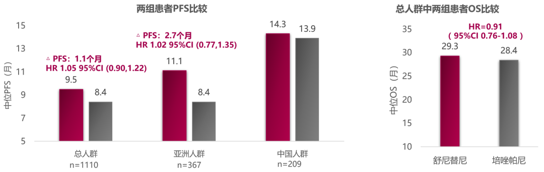 其中,COMPARZ研究是一项头对头、随机、开放标签、III期、非劣效性研究,共纳入1110例晚期肾透明细胞癌患者,旨在评价舒尼替尼和培唑帕尼一线治疗晚期肾透明细胞癌的疗效和安全性。研究结果表明,无论是总人群、亚洲人群还是中国人群,舒尼替尼对比培唑帕尼用于mRCC一线治疗,PFS/OS数值上均更优[4-6]