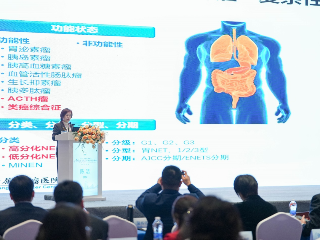 CACA神经内分泌肿瘤专委会主任委员、复旦大学附属肿瘤医院神经内分泌肿瘤中心主任陈洁教授进行了关于“肺神经内分泌肿瘤的探索与实践”的主题报告。