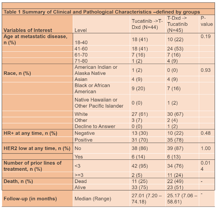 本研究由美国德克萨斯大学MD安德森癌症中心学者发起,他们应用一个大型的单机构数据库数据,对2020年4月至2023年3月期间接受图卡替尼方案或T-DXd治疗的HER2阳性MBC患者开展了回顾性队列研究。对89例女性MBC患者的数据进行了回顾性分析,比较了两组人群的治疗疗效:一组是先接受图卡替尼治疗,后接受T-DXd治疗的患者(n=44);另一组是先接受德曲妥珠单抗治疗,后接受图卡替尼治疗的患者(n=45)。主要终点是总生存期(OS)和无进展生存期(PFS):OS从最早开始治疗的时间算起,直至患者死亡或最后一次随访。对每种治疗方案的PFS进行序贯评估。