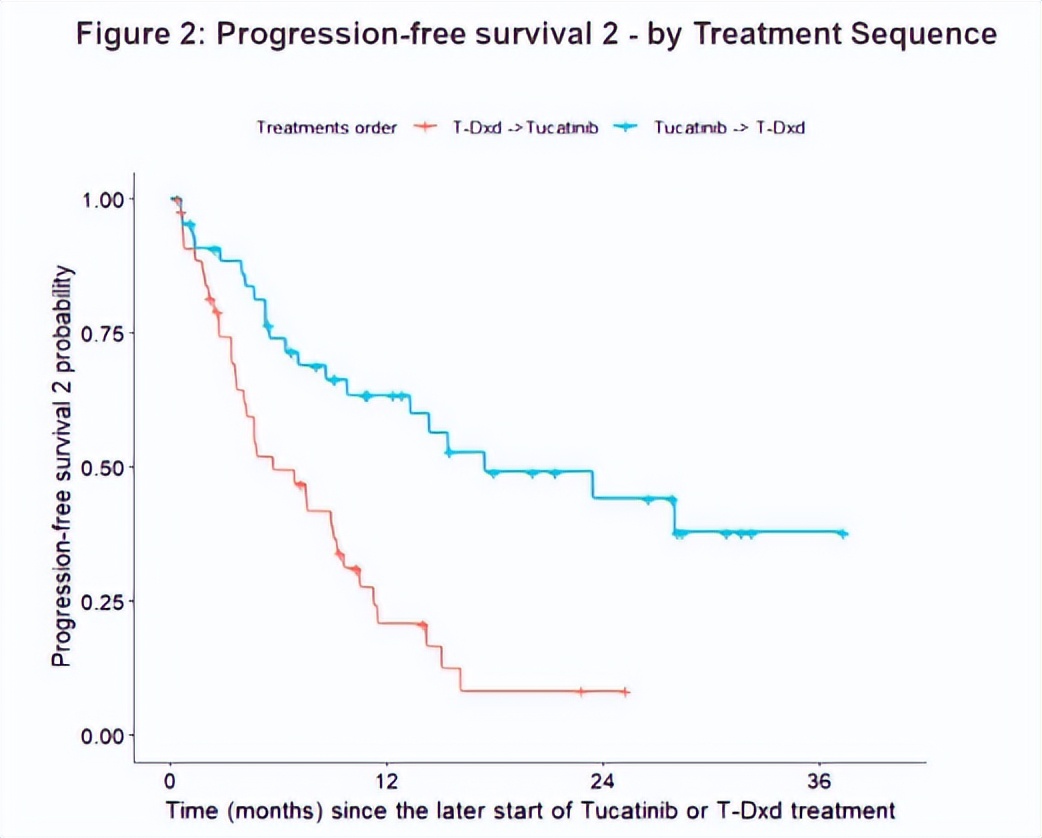 对于在图卡替尼之前接受T-DXd治疗的患者,PFS1定义为从开始T-DXd治疗到疾病进展、死亡或最后一次随访的时间。PFS2定义为从开始图卡替尼治疗到最早出现疾病进展、死亡或最后一次随访的时间。使用Kaplan-Meier曲线、对数秩检验和COX比例风险模型进行分析(P<0.05),分析在R 4.2.2软件中进行。