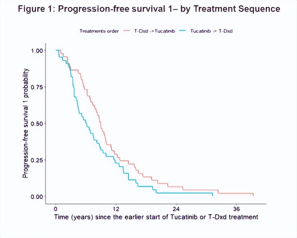 优化转移性乳腺癌(MBC)患者的序贯治疗方案至关重要。然而,在一线治疗(紫杉烷类、曲妥珠单抗和帕妥珠单抗)之后,图卡替尼联合卡培他滨方案与T-DXd治疗方案的最优序贯方式尚不明确,目前尚无随机III期研究来确定最佳序贯方案。2025年ESMO BC年会上一项研究(摘要号:337P)比较了不同序贯治疗方案的临床疗效[1]