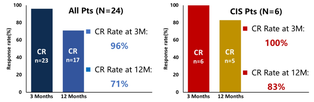 何志嵩教授:这两项研究目前都处于在研阶段,最终数据尚未发布,北京大学第一医院是参研中心之一。从初步的中期研究结果来看,它们都达到了我们的预期和希望,因此有望继续进行这些研究。BH011是一种新型多西他赛膀胱灌注制剂,可提高药物浓度和组织渗透性。我们的1/2期研究显示,BH011用于BCG失败的高危NMIBC患者,3个月和1年完全缓解率(CRR)分别达96%和71%,中位无复发生存(RFS)达20.21个月,且耐受性好,仅发生1-2级不良事件(常见尿路感染、血尿等),无治疗中断。