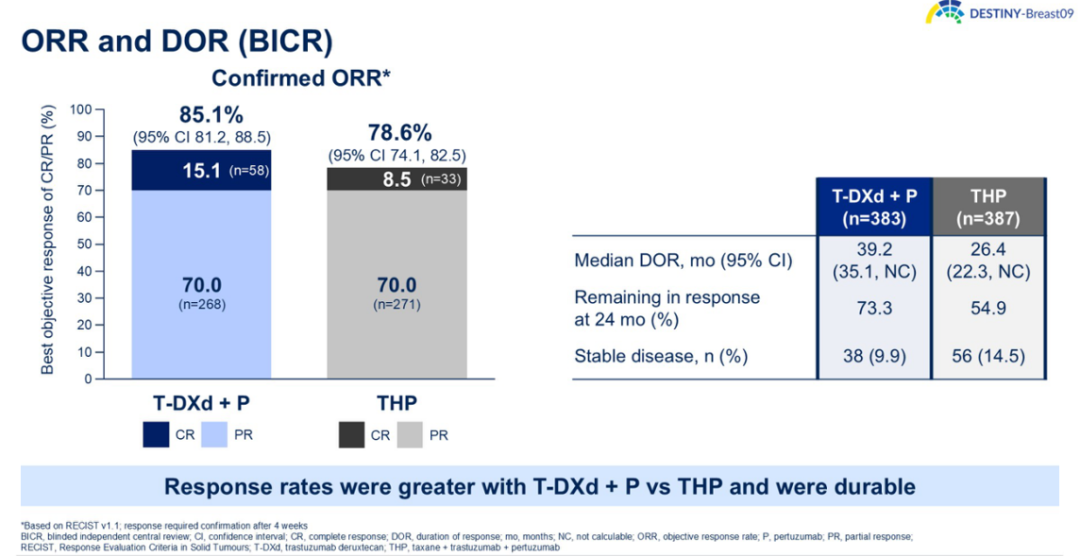 在所有患者亚组中,T-DXd联合帕妥珠单抗均显示出PFS获益。与THP相比,T-DXd联合帕妥珠单抗的额外改善还包括更高的总缓解率(85.1%vs 78.6%)、更高的完全缓解率(15.1%vs 8.5%)和更长的中位缓解持续时间(39.2个月vs 26.4个月)。
