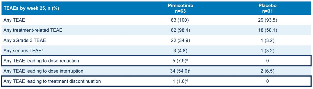 在安全性方面,Pimicotinib基本上是可控、可耐受的。Pimicotinib组和安慰剂组的严重治疗期间不良事件(TEAEs)发生率分别为4.8%和3.2%,Pimicotinib组的减剂量和停药TEAEs仅分别为7.9%和1.6%。Pimicotinib较为常见的3/4级TEAE为疲劳(22.6%)、肌酸激酶升高(12.7%),没有发生胆汁淤积、肝酶升高等肝毒性事件。