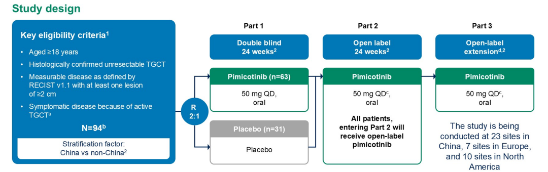Pimicotinib是一种高选择性、高效CSF-1R酪氨酸激酶抑制剂,既往的1/2研究显示其TGCT有积极的治疗活性。为了进一步验证其疗效和安全性,我们开展了这项全球多中心III期MANEUVER研究。该研究共纳入94例有症状的活动性TGCT成人患者,在第一阶段(双盲期)按照2:1的比例随机接受口服Pimicotinib 50mg QD或安慰剂治疗,随访24周后进入第二(开放期)和第三(扩展期)部分。研究的主要终点是第25周时由盲法独立审查委员会(BIRC)根据RECIST v1.1评估的客观缓解率(ORR)。