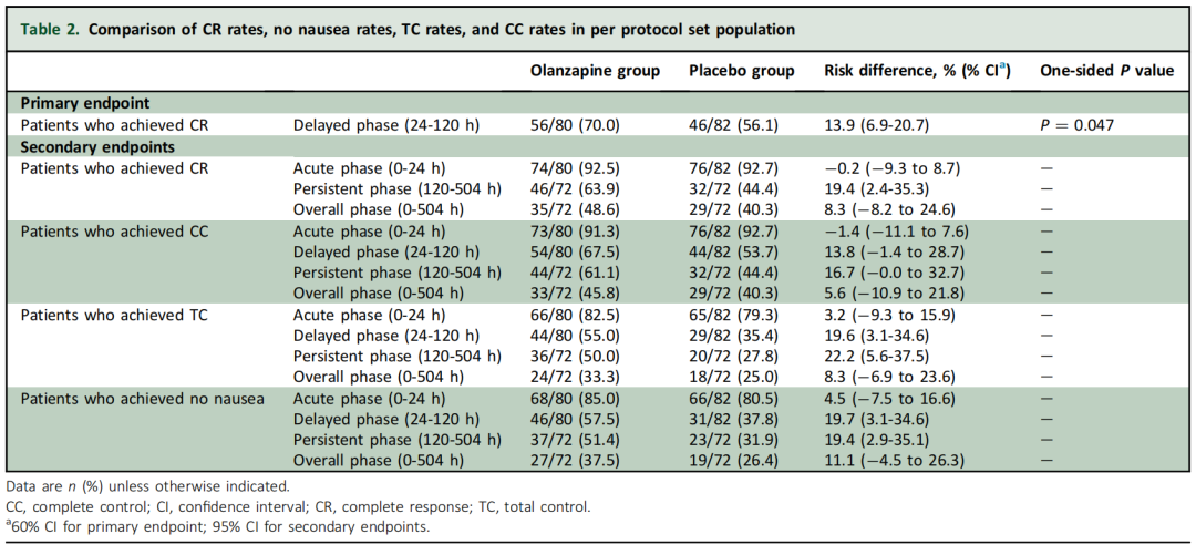研究的主要观察终点是延迟期的完全缓解(CR)率。次要终点包括急性期、持续期和总体的CR率,以及各时期的无恶心率等。