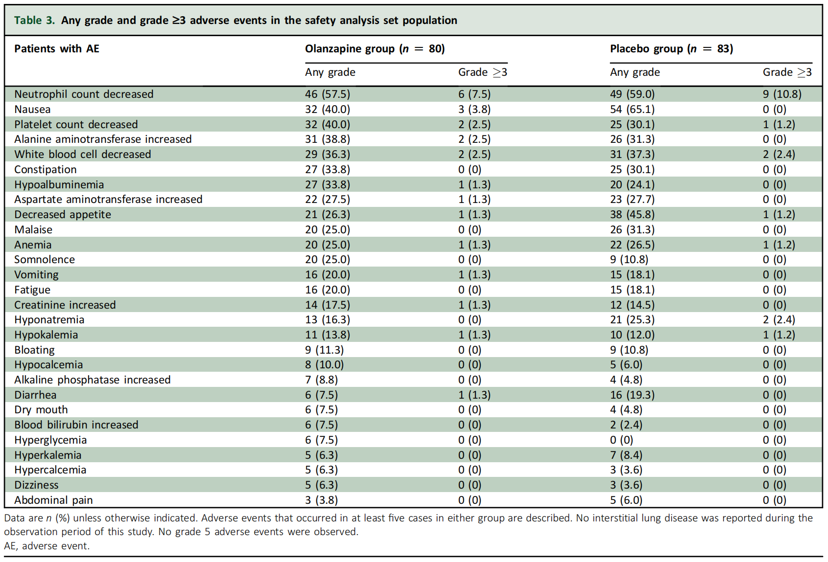 根据患者报告的不良事件(PRO-CTCAE)评估,奥氮平组的食欲减退发生率较低(任何级别:60.0%vs 80.7%),并且对日常活动的干扰也较小(任何级别:41.3%vs 73.5%)。此外,奥氮平组的腹泻发生率也较低(任何级别:51.3%vs 67.5%),这表明奥氮平在改善患者整体症状方面具有潜在优势。