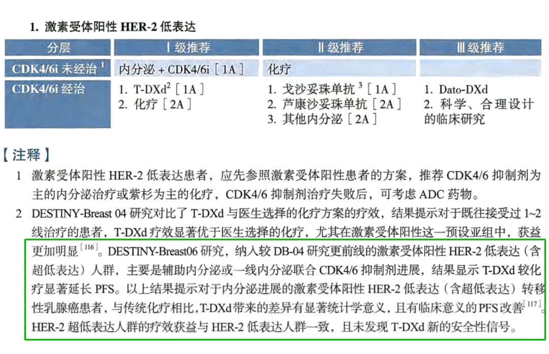 国内最新版的CSCO-BC(2025)、CACA-CBCS精要版(2025)、ABCC指南(2024),针对CDK4/6i+ET经治患者,均推荐T-DXd作为HER2低表达患者的优选方案;而鉴于药物可及性,靶向联合内分泌治疗(如mTORi+ET)在国内指南中仍是CDK4/6i+ET经治患者的优选方案之一,但需注意mTORi目前缺乏CDK4/6i经治的高质量循证医学证据。此外,由于T-DXd超低表达国内适应症尚在审批中,国内指南尚未列入推荐,但已经在注释中引用或介绍了DB-06的循证医学证据。相信随着相关适应症获批,国内指南对T-DXd在post-CDK4/6i中的应用推荐会进一步扩大。