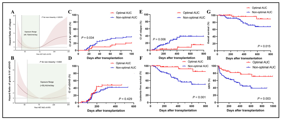图1.图A和B显示了基于限制性立方样条模型分析的ATG暴露与复发风险及II-IV级aGVHD风险之间的关系。红色实线表示风险比的点估计,红色阴影区域为95%CI,绿色区域为最佳暴露范围。图C至H展示了是否处于最佳AUC范围内的患者在aGVHD、cGVHD、复发、LFS、OS和GRFS方面的比较(红色为达标组,蓝色为未达标组)。