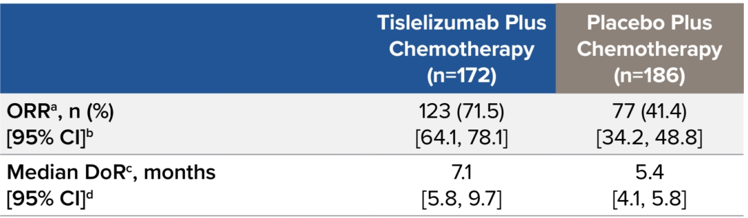 同时,替雷利珠单抗联合化疗组还展现出更高的ORR及更长的DoR(表2),ORR为71.5%vs 41.4%;mDoR延长1.7个月(7.1个月vs 5.4个月),印证了其缓解深度。