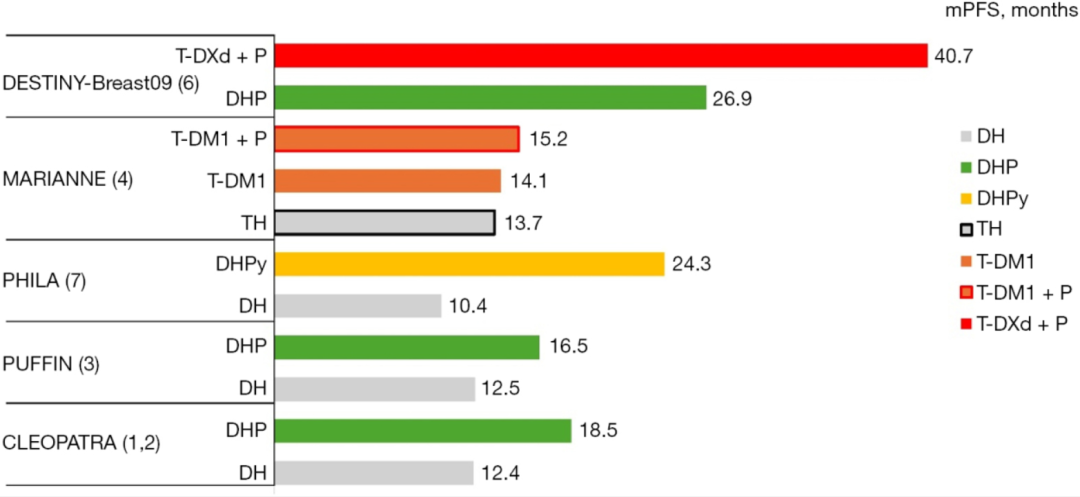 图2.不同研究中HER2阳性乳腺癌一线治疗的PFS