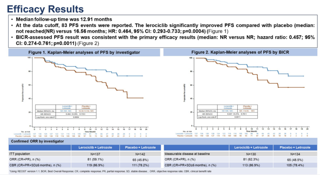 作为一名临床医生,在众多临床评价指标中,我更为关注患者的治疗疗效。在疗效方面,此前发表于Nature Communications的LEONARDA-1研究,已为二线治疗的HR+/HER2-晚期患者提供了较为可靠的循证医学证据。该研究结果显示,来罗西利组相较于安慰剂组,患者的无进展生存期(PFS)得到了显著改善[11.07个月vs 5.49个月,HR=0.451,95%CI:0.311~0.656,P=0.000016]。