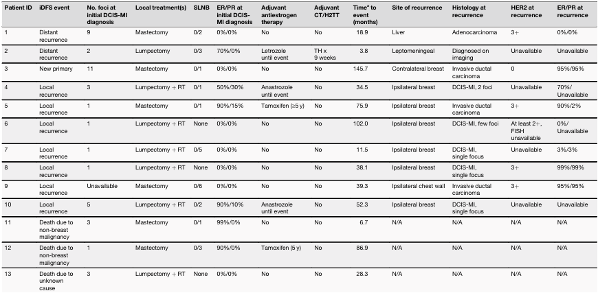 研究者最终纳入213例符合上述标准的乳腺癌患者。诊断时的中位年龄为55岁。212例患者(99.5%)为DCIS-MI,1例(0.5%)为小叶原位癌伴小叶微浸润癌。169例(79.3%)DCIS成分为高级别,伴有中度、中心性或显著坏死。211例患者(99.1%)的微浸润成分HER2 3+,2例(0.9%)为HER2 1-2+并且FISH+。155例患者(72.8%)存在多发性MI灶。85例(39.9%)患者接受了保乳手术,其中82例(96.5%)接受了辅助放疗。128例(60.1%)患者接受了全乳切除术,其中48例(37.5%)接受了对侧乳房切除术。184例(86.4%)患者接受了前哨淋巴结活检。35例(16.4%)患者接受了辅助化疗和/或HER2靶向治疗,主要方案为TH(n=33,94.3%)。52例(24.4%)为ER/PR+微浸润癌,其中40例(76.9%)接受了辅助内分泌治疗。15例(7.0%)患者为ER/PR低阳性(肿瘤细胞的1-10%)微浸润癌,其中4例(26.7%)接受了辅助内分泌治疗。