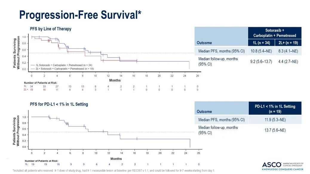 2、第2种组合策略是与化疗联合。2024年ASCO年会公布了CodeBreak101研究结果,该研究入组初治/经治局部晚期或转移性NSCLC患者,携带KRAS G12C突变,符合入组标准的患者接受索托拉西布960mg,口服,每日一次联合标准剂量的含铂双药化疗,4周期后如果患者无进展,给予索托拉西布联合培美曲塞的维持治疗,主要终点为安全性及耐受性,次要研究终点为ORR、PFS等。最终,初治和经治组分别入组37例和21例患者,分别有97%和95%的患者基线有远处转移病灶,其中脑转移比例分别为16%和24%,3级以上治疗相关不良反应发生率分别为49%和62%,较常见为中性粒细胞降低,发生率分别为30%和29%,ORR分别为65%和42%,DCR分别为100%和84%,中位PFS分别为10.8个月和8.3个月。其中,PD-L1<1%的患者,一线治疗的中位PFS为11.9个月。