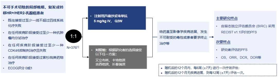 OptiTROP-Breast02是一项在我国开展的多中心、随机对照、开放标签III期临床研究(NCT06081959),旨在评估芦康沙妥珠单抗相较于研究者选择的化疗(TPC,含艾立布林、长春瑞滨、吉西他滨和卡培他滨)治疗既往在任何疾病阶段接受过≥1种内分泌治疗(含≥1种CDK4/6抑制剂治疗且失败),且在晚期或转移性阶段接受过其它系统治疗、在任何阶段接受过紫杉烷类治疗的不可切除局部晚期或转移性HR+/HER2-乳腺癌患者的有效性和安全性。该研究在设计上充分考虑到临床实践现状及未满足的迫切治疗需求,即CDK4/6抑制剂经治患者占比逐渐增多,且现有治疗失败后仍缺少有效的后线治疗选择。