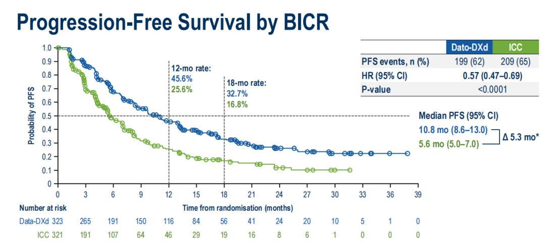 Dato-DXd组由BICR评估的中位PFS为10.8个月(95%CI:8.6-13.0),而ICC组为5.6个月(95%CI:5.0-7.0),Dato-DXd相较于化疗使患者中位PFS延长5.3个月,疾病进展或复发风险降低43%,HR 0.57(95%CI:0.47-0.69);P<0.0001。研究者评估的PFS与BICR评估的PFS一致。