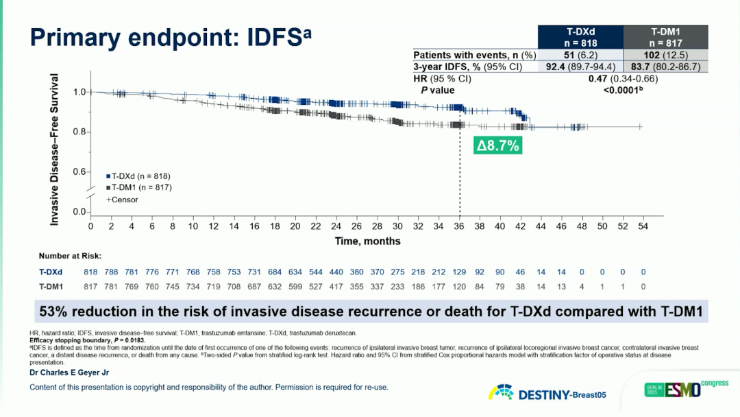 该研究结果符合我们的预期:T-DXd组较T-DM1组显著改善3年IDFS率,为92.4%vs 83.7%,风险比(HR)达到0.47,降低了53%的疾病事件风险,取得了令人满意的成果。