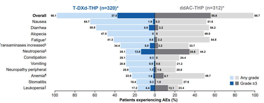 值得注意的是,T-DXd-THP方案是一种去蒽环类方案。长期以来,蒽环类药物在乳腺癌治疗中处于基石地位,但随着有效治疗选择的增多,去蒽环策略已成为热门研究方向。DB-11研究结果证实,对于HER2阳性早期乳腺癌的新辅助治疗,T-DXd-THP方案在疗效角度可以有效实现去蒽环,在安全性角度较标准ddAC-THP方案降低了三级以上不良事件发生率。