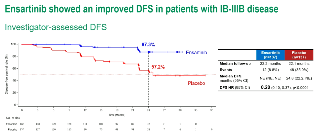 2022年7月至2024年7月,274名患者被随机分配到治疗组(恩沙替尼:137,安慰剂:137)。两组中IB期受试者分别为24.8%/25.5%,II-IIIB期为75.2%/74.5%,女性66.4%/61.3%,68.6%/70.8%接受辅助化疗治疗。