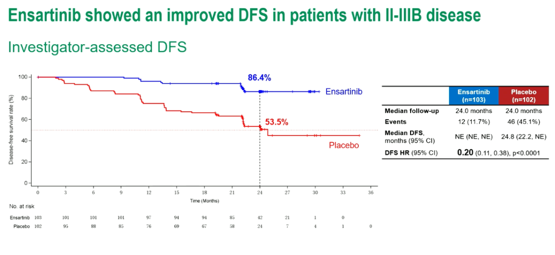 截止到2025年6月26日,在II-IIIB期患者中,两组中位随访时间均为24.0个月。DFS HR为0.20(95%CI:0.11-0.38;P<0.0001);恩沙替尼组2年DFS率为86.4%,安慰剂组为53.5%。在ITT人群中,DFS HR为0.20(95%CI:0.10-0.37;P<0.0001);恩沙替尼组2年DFS率为87.3%,而安慰剂组为57.2%。各亚组中,倾向于恩沙替尼的DFS获益一致。在ITT人群中观察到具有临床意义的CNS-DFS获益(HR 0.22;95%CI:0.08-0.60)。OS不成熟(1%成熟度)。安全性与恩沙替尼的已知安全性一致。